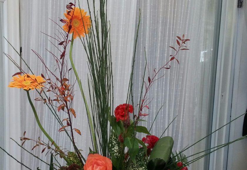 毎週水曜13時半からのフラワーアレンジ。秋も深まり秋のアレンジに挑戦です。赤とオレンジのアレンジ、二つのタイプを2週続けてのお教室。お花もよく持つ時期になり、お店も華やかに見えます